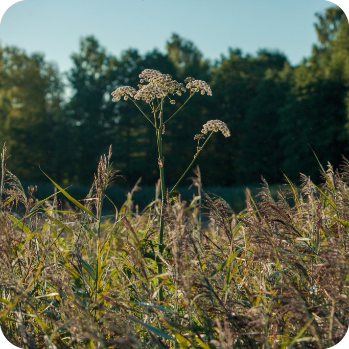 Angelica (Angelica sylvestris) is a tall, herbaceous plant native to UK. It belongs to the Apiaceae family and typically grows in damp, grassy areas. It features hollow stems, large divided leaves, and clusters of small white to pinkish flowers that form umbrella-shaped inflorescences, blooming from mid-summer to early autumn. The plant traditionally been used in herbal medicine for digestive issues and respiratory ailments, though it should be used with caution due to potential toxicity in high doses. Its seeds and roots are also aromatic, commonly used in flavouring.