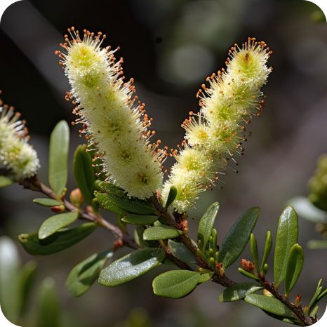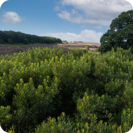 Bog Myrtle (Myrica gale) is a small, aromatic deciduous shrub that grows well in wet, acidic soils and damp heathlands. Its slender branches carry glossy, dark green leaves that release a spicy fragrance when crushed. In spring, the plant produces yellowish catkins that attract early pollinators. It forms dense clumps that provide shelter for wildlife and contributes to the structure and biodiversity of bogs and wetlands.
