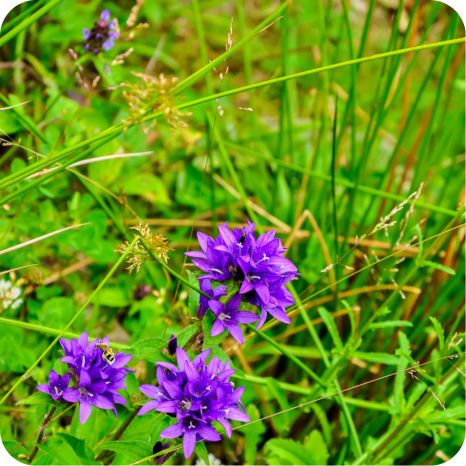 Clustered Bell Flower (Campanula glomerata) grows from strappy green leaves and produces large clusters of vibrant purple flowers. It is found throughout Britain and thrives in open grassy habitats, particularly on calcareous soils. The plant’s upright stems and dense flower clusters make it highly visible in meadows, grasslands, and roadside verges. Campanula glomerata attracts a range of pollinators, adding both colour and ecological value to wildflower-rich landscapes. Its striking blooms and hardy growth make it a popular choice for naturalistic gardens and conservation plantings.