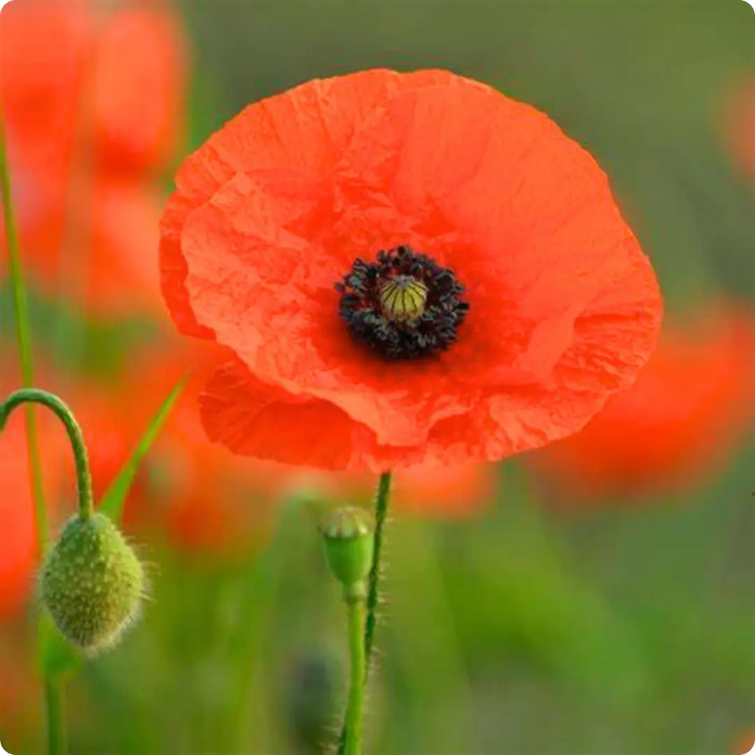 Common Poppy (Papaver rhoeas) is a vibrant annual wildflower with striking scarlet petals, often marked with a black spot at the base. It grows on slender, hairy stems and produces delicate seed pods after flowering. The plant thrives in meadows, gardens, and roadside verges, creating bold bursts of colour. It attracts bees and other pollinators, making it both visually striking and ecologically valuable.