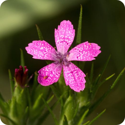 Deptford Pink (Dianthus armeria) is a delicate biennial wildflower with clusters of small, bright pink blooms. Each flower is star-shaped and speckled with pale markings, giving it a soft, detailed beauty. It grows best in dry grasslands, field edges, and open ground where it enjoys full sun and light soils. Flowering through the summer, it adds splashes of vibrant colour to natural landscapes. Its nectar rich blooms attract bees, butterflies, and other pollinators, making it both striking and valuable for wildlife. Though small and dainty, Deptford Pink brings brightness and life to every wildflower patch.