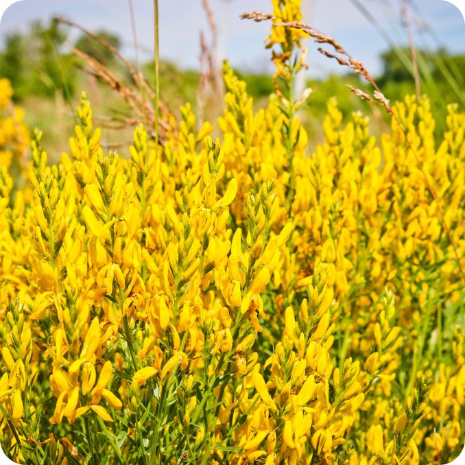 Dyer’s Greenweed (Genista tictoria) is a vigorous, deciduous shrub commonly found in grasslands, heathlands, and open woodlands across the UK. It produces bright yellow pea-like flowers from late spring to summer, attracting pollinators like bees and butterflies. Historically used as a natural dye, this shrub thrives in well-drained, sunny spots and contributes to soil health through nitrogen fixation.