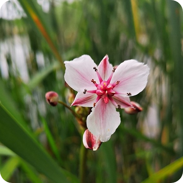 Flowering Rush (Butomus umbellatus) is an elegant aquatic perennial with long, triangular, twisted leaves that can reach over 100 cm in length. In summer, it produces striking clusters of soft pink flowers arranged in an umbrella-like shape. Each bloom features six delicate petals, nine stamens, and six pistils. Found along the edges of rivers, lakes, and ponds, Butomus umbellatus adds height, colour, and structure to wetland habitats.