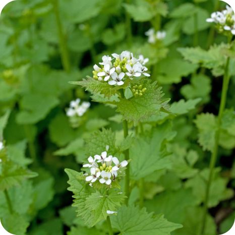 Hedge Garlic (Alliaria petiolata) is a biennial herb native to Europe with heart-shaped leaves and small, white, four-petaled flowers. When crushed, its foliage releases a strong garlic-like aroma. The plant thrives in woodlands, hedgerows, and disturbed soils, often spreading rapidly. Alliaria petiolata provides early nectar for pollinators in spring and adds structural interest to shaded and semi-shaded habitats.