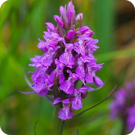 Northern Marsh Orchid (Dactylorhiza purpurella) is a compact perennial with dense spikes of striking purple flowers that bloom from late spring to early summer. Its lance-shaped, often spotted green leaves form a neat clump at the base, enhancing the plant’s overall appearance. Thriving in damp meadows, marshes, and wet grasslands, it attracts bees and other pollinators. Dactylorhiza purpurella adds vibrant colour and ecological value to upland and wetland habitats.