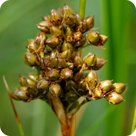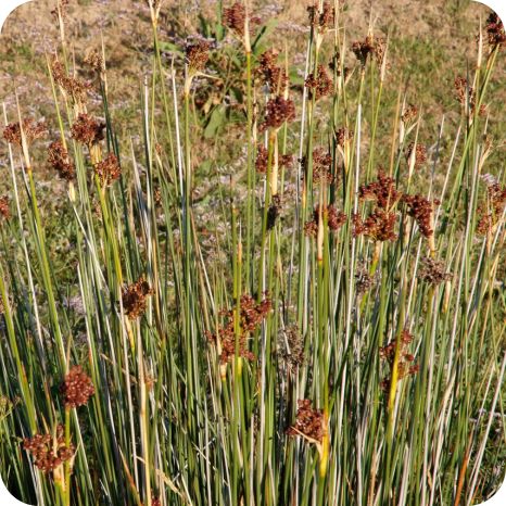 Sharp Rush (Juncus acutus) is a robust, evergreen perennial growing 60–120 cm tall, with stiff, dark green, spiky foliage. From June to August, it produces clusters of brown, inconspicuous flowers along its stems. The plant thrives in wet, sandy, or saline soils, making it ideal for coastal marshes, ponds, and damp meadows. Juncus acutus adds structure, texture, and year-round greenery to naturalistic and wetland plantings.