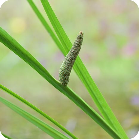 Sweet Flag (Acorus calamus) is a tall, perennial wetland plant with long, narrow, sword-like leaves that emit a distinctive sweet fragrance. From mid to late summer, it produces small, yellow-green, inconspicuous flowers along short spikes. The plant thrives in ponds, marshes, and slow-moving waterways, providing structure and habitat for aquatic wildlife. Acorus calamus adds height, texture, and sensory interest to naturalistic and wetland gardens.