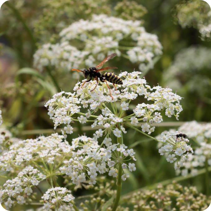Ensure Water Parsnip is planted in moist or aquatic areas to support its height of up to 150 cm and encourage healthy blooming during its peak flowering. |