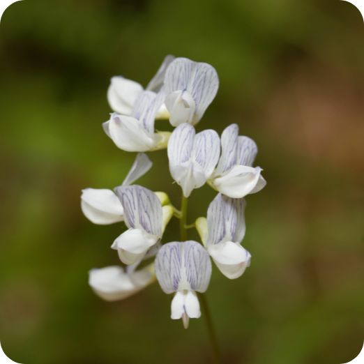 Wood Vetch (Vicia sylvatica) is a vigorous, trailing perennial with delicate pea-like flowers in shades of white to pale violet. Blooming from late spring to summer, it climbs and sprawls through woodlands, hedgerows, and grassy areas, using surrounding vegetation for support. The plant attracts bees and other pollinators while adding vertical interest, colour, and ecological value to naturalistic and semi-shaded landscapes.
